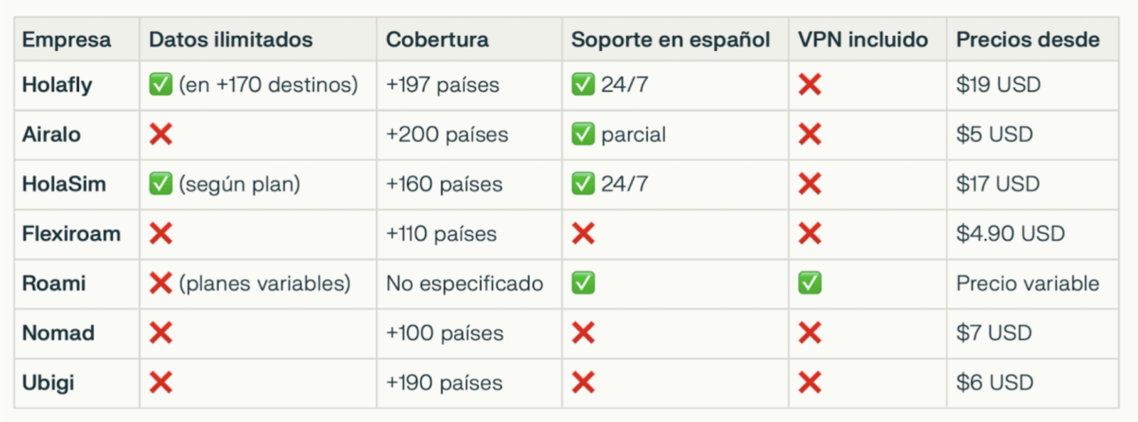 •Holafly: Precios más altos que la media (ej: $47 USD para 15 días en EE.UU.).